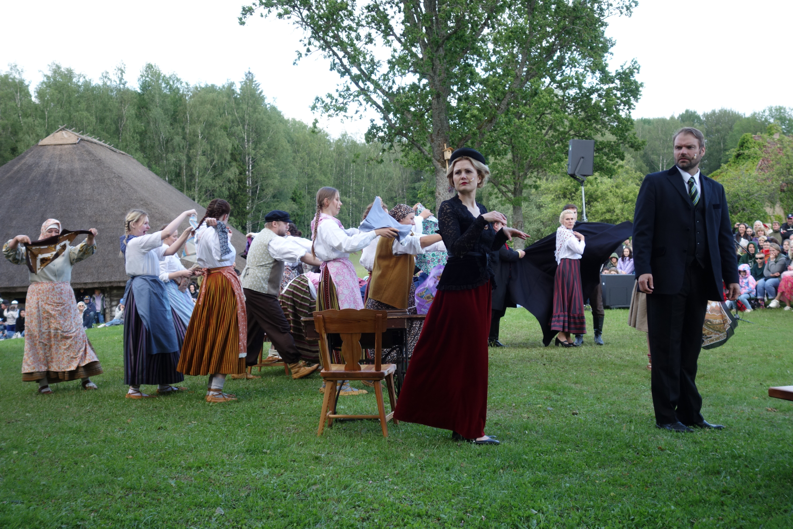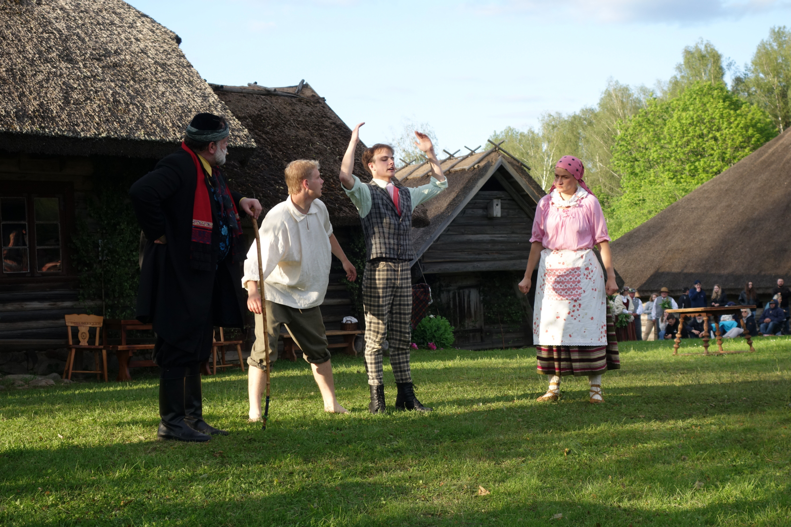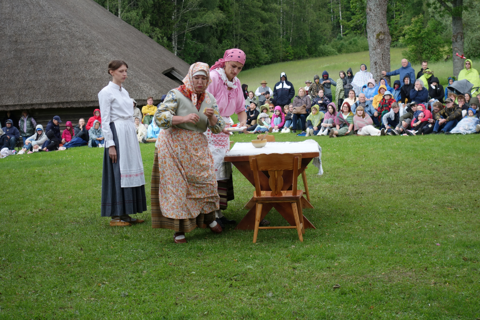Kaut arī visu dienu pārstaigāja lietus mākoņi, izrādes laikā spīdēja jauka un mīlīga vakara saule. Vēl mazs mirklis, mazs lietus mākonītis, un viss varēja sākties – ar azartiskajiem notikumiem, ar skroderu iebraukšanu sētā, ar pārpratumiem, ar Ābrama uzraušanos uz krāsns, ar Pindacīšas rosīšanos, ar Tomuļu mātes apriebšanu, ar Rūda, Kārlēna un Ieviņas jautrībām, ar Bebenes pīpēšanu, ar Auces un Pičuka laimi pirtiņā, ar sievu ķīviņu, ar Pindaka stingrību, ar Elīnas un Alekša sāpi un nopietno izrunāšanos, ar Antonijas lielo laimi un vilšanos, ar Joskes un Zāras kluso un kaislīgo mīlestību, ar jautro līgošanu un dancošanu un laimīgajām beigām, kad no vienām kāzām sanāca veselas trīs. Vai “Skroderdienas” nav laimīga luga? Un vai tauta nesmējās no sirds? Bija viss – gan smiekli, gan sajūsma, gan kādam pa asarai nobira, gan skaļi aplausi, gan līdzi dziedāšana. Un piepildījās, ko R. Blaumanis reiz teicis: “Man patīk, kad tauta smejas.”